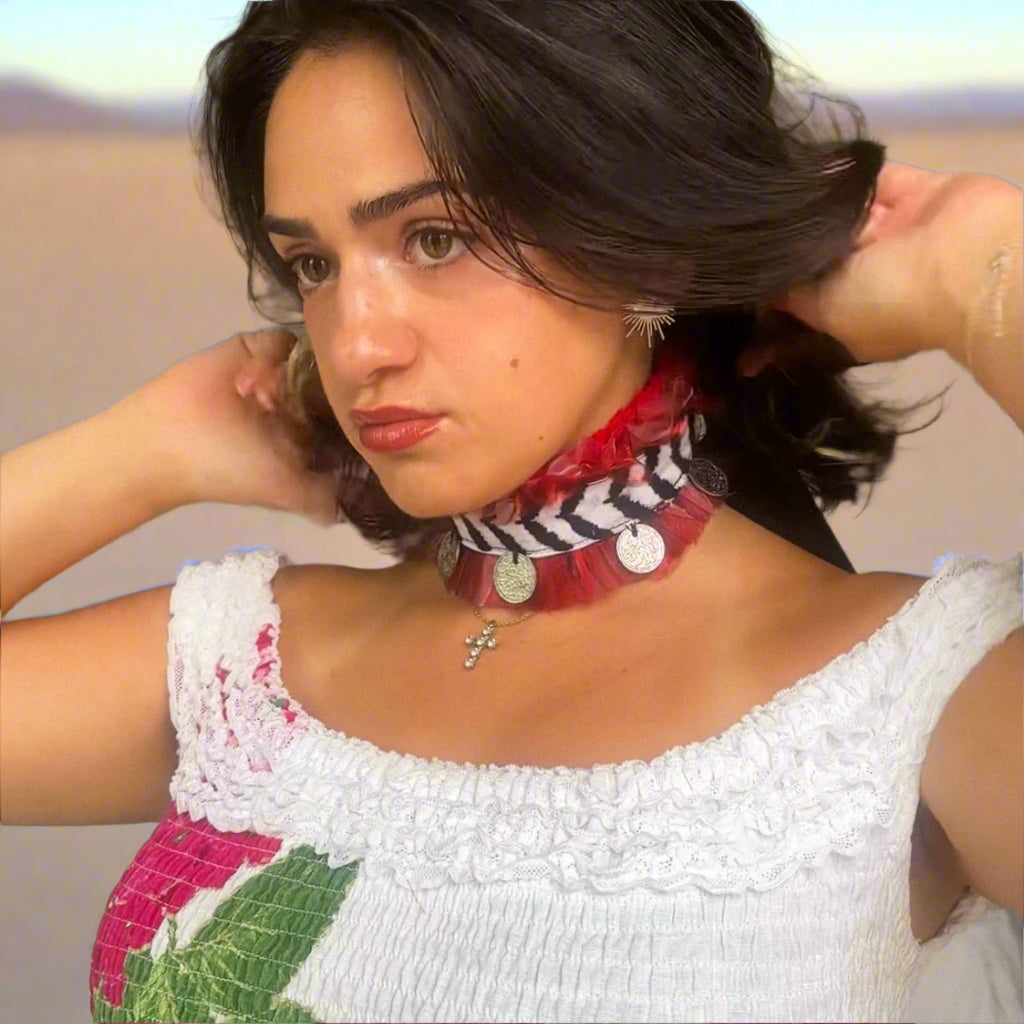 Inspired by the iridescent layers of heritage and resistance, this statement necklace reimagines the traditional keffiyeh into a striking summer accessory. Featuring the iconic black-and-white Palestinian pattern, it’s framed with ruffled red organza and embellished with authentic Ottoman coins sourced in Amman — each one telling a story of its own.