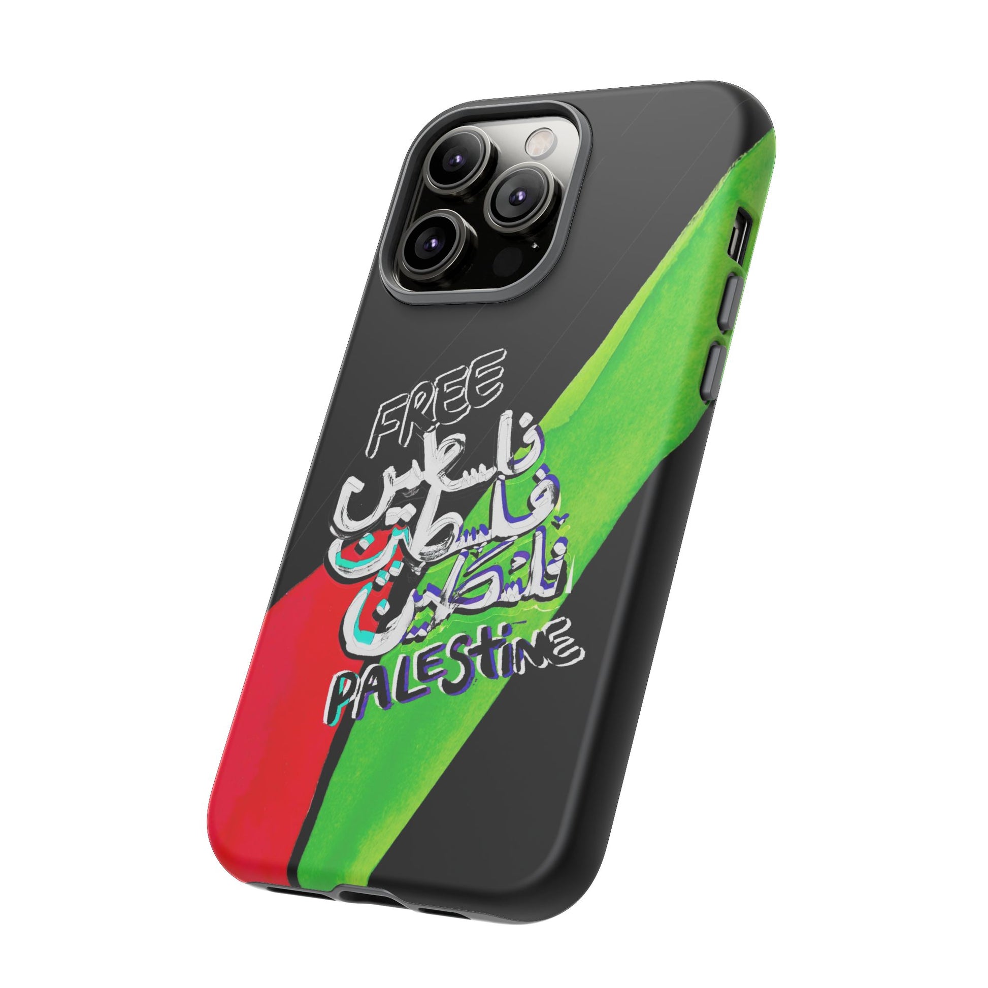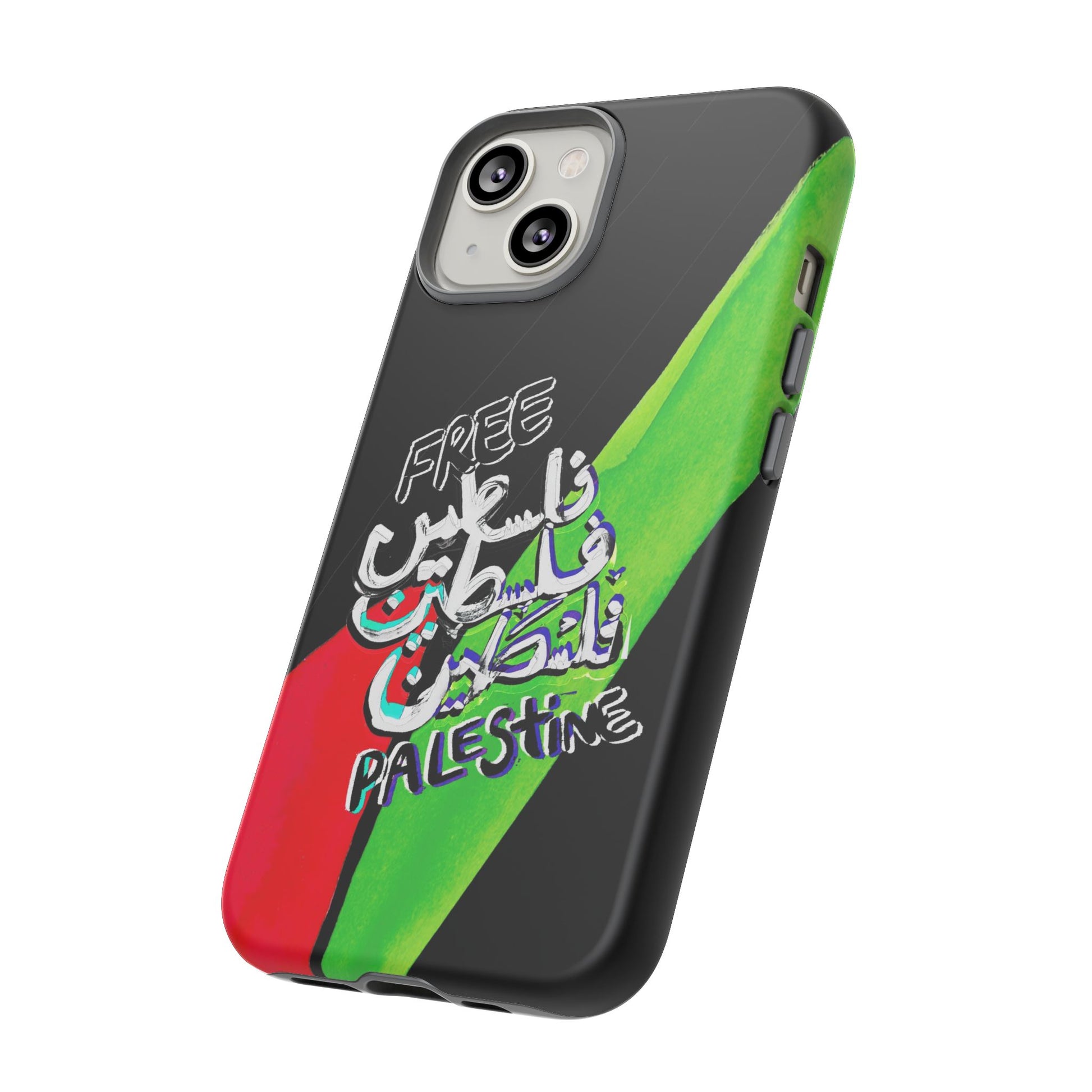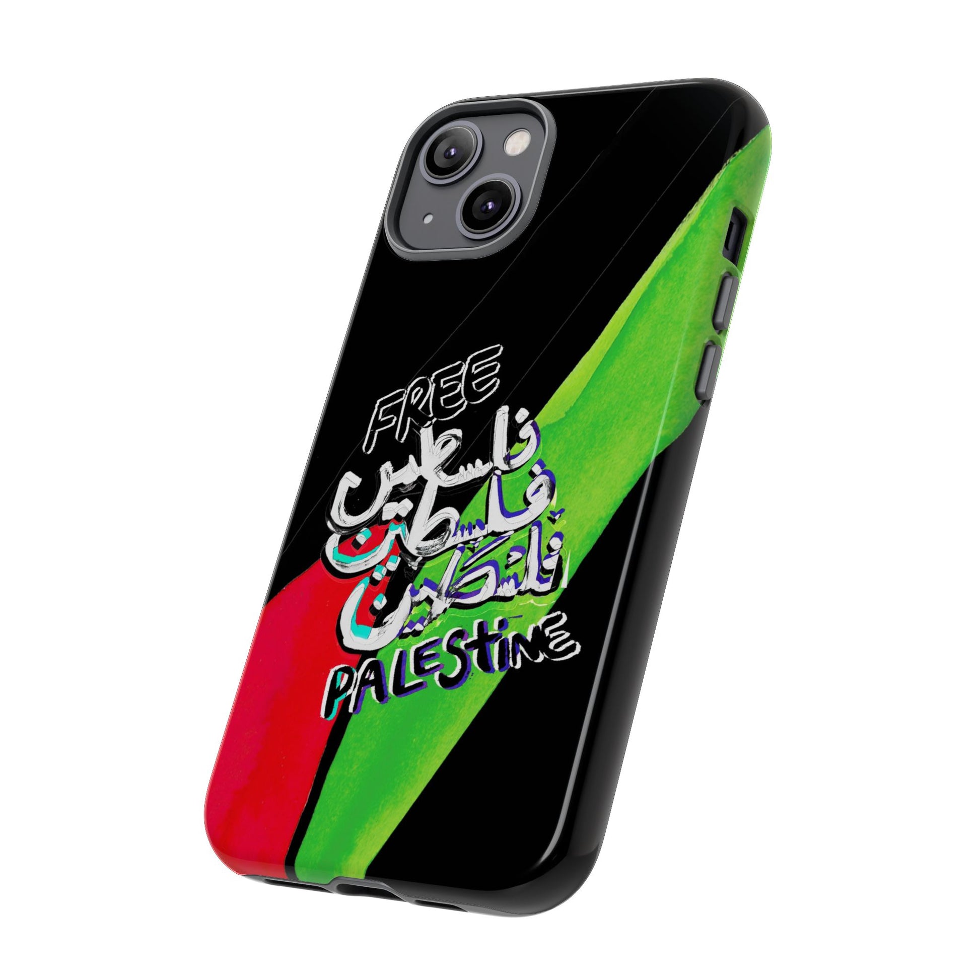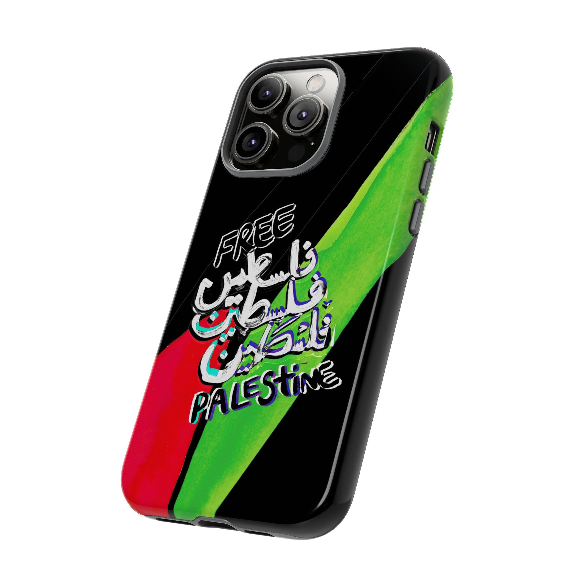 Introducing our exquisite hand-painted Palestine flag and text meticulously crafted onto our stunning tough case, designed to champion aid for Palestine. The text says "Palestine" in Arabic, x3: فلسطين