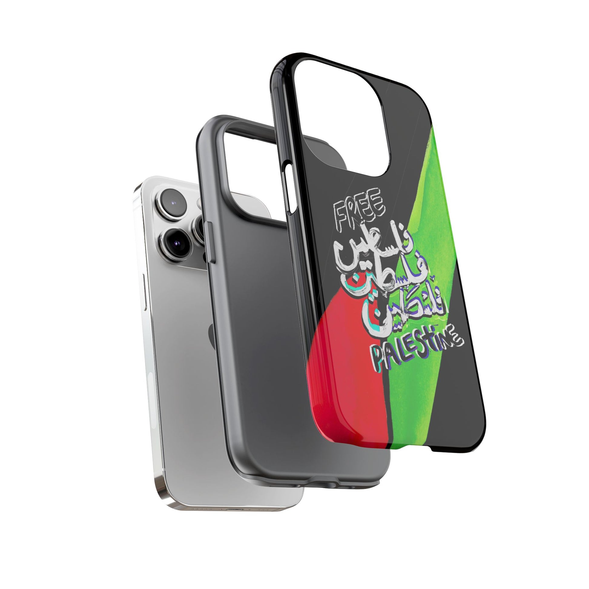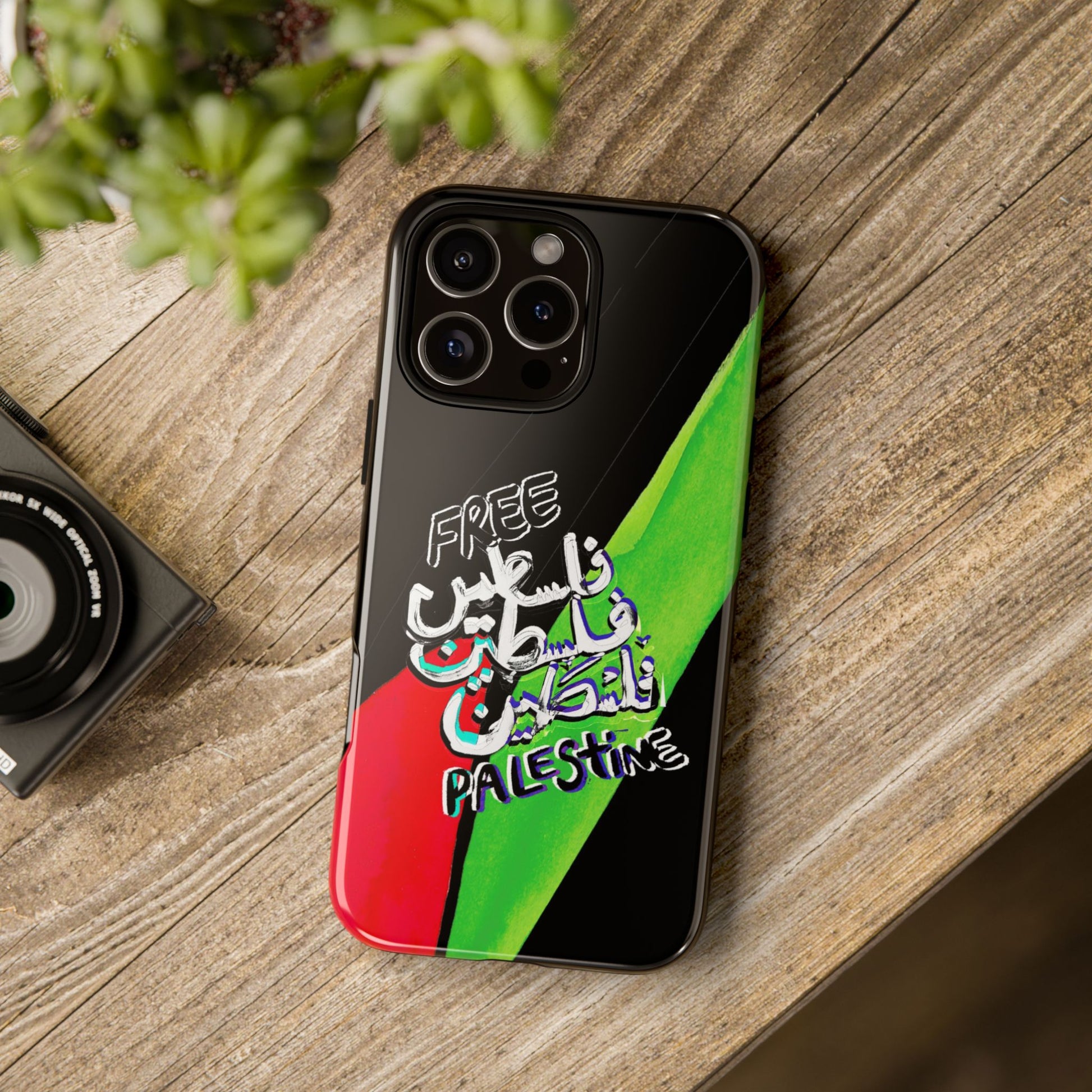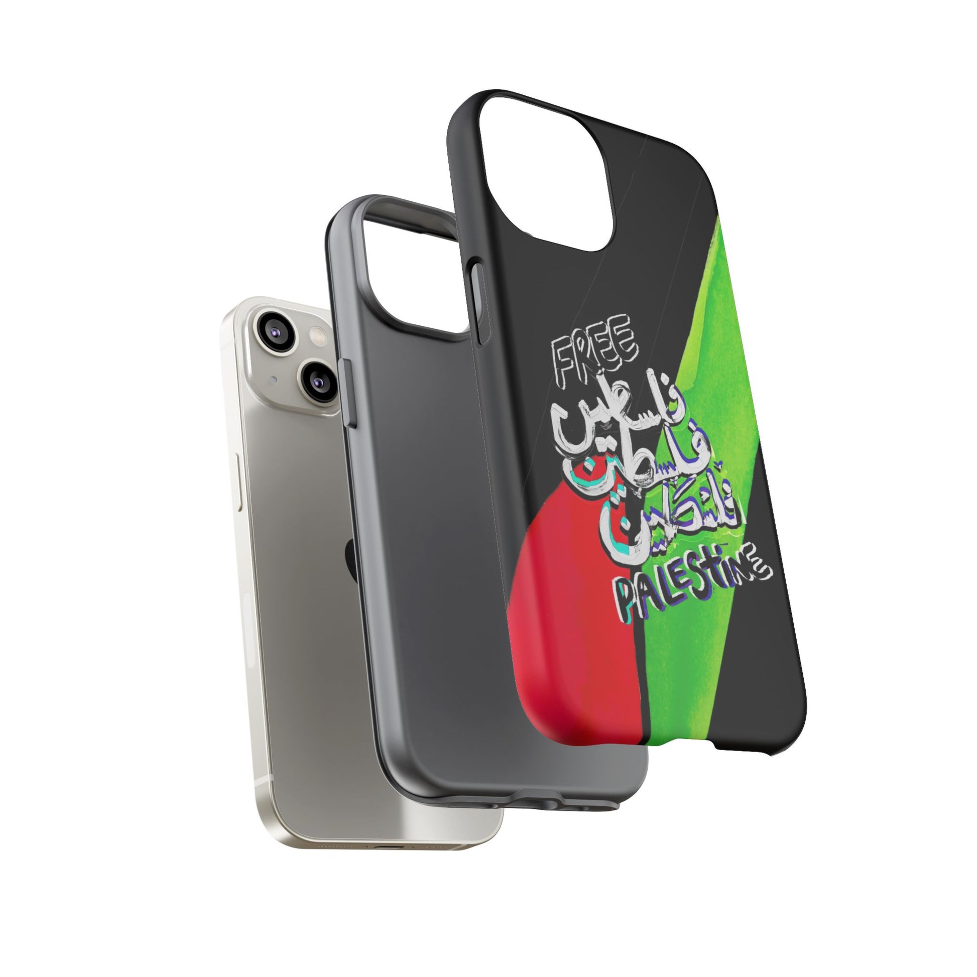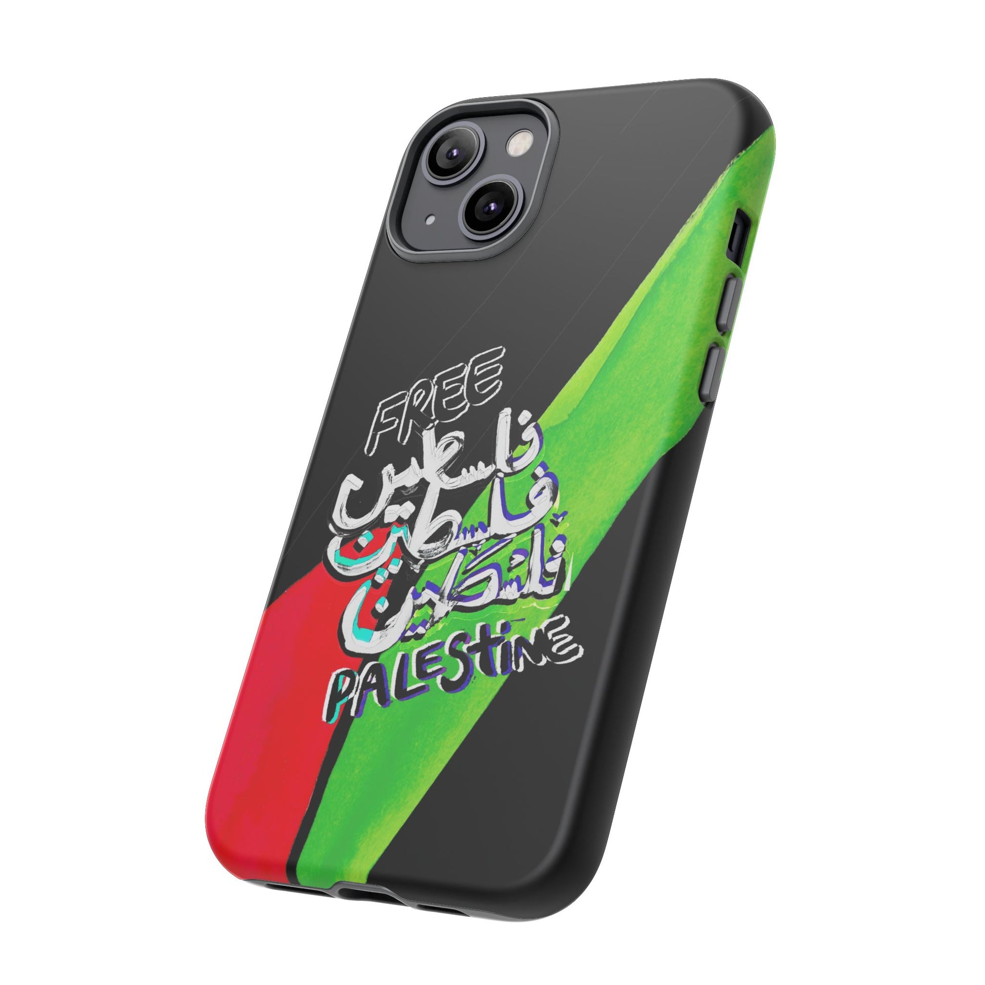 Introducing our exquisite hand-painted Palestine flag and text meticulously crafted onto our stunning tough case, designed to champion aid for Palestine. The text says "Palestine" in Arabic, x3: فلسطين