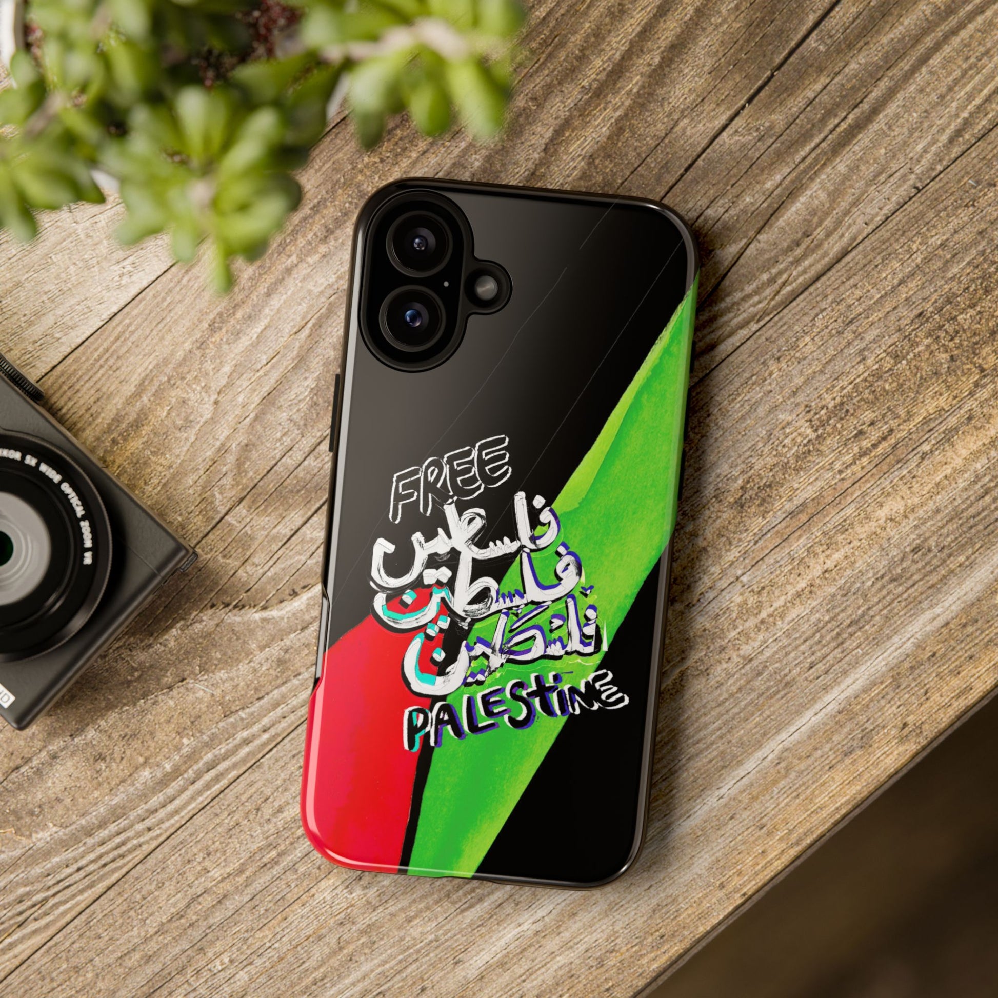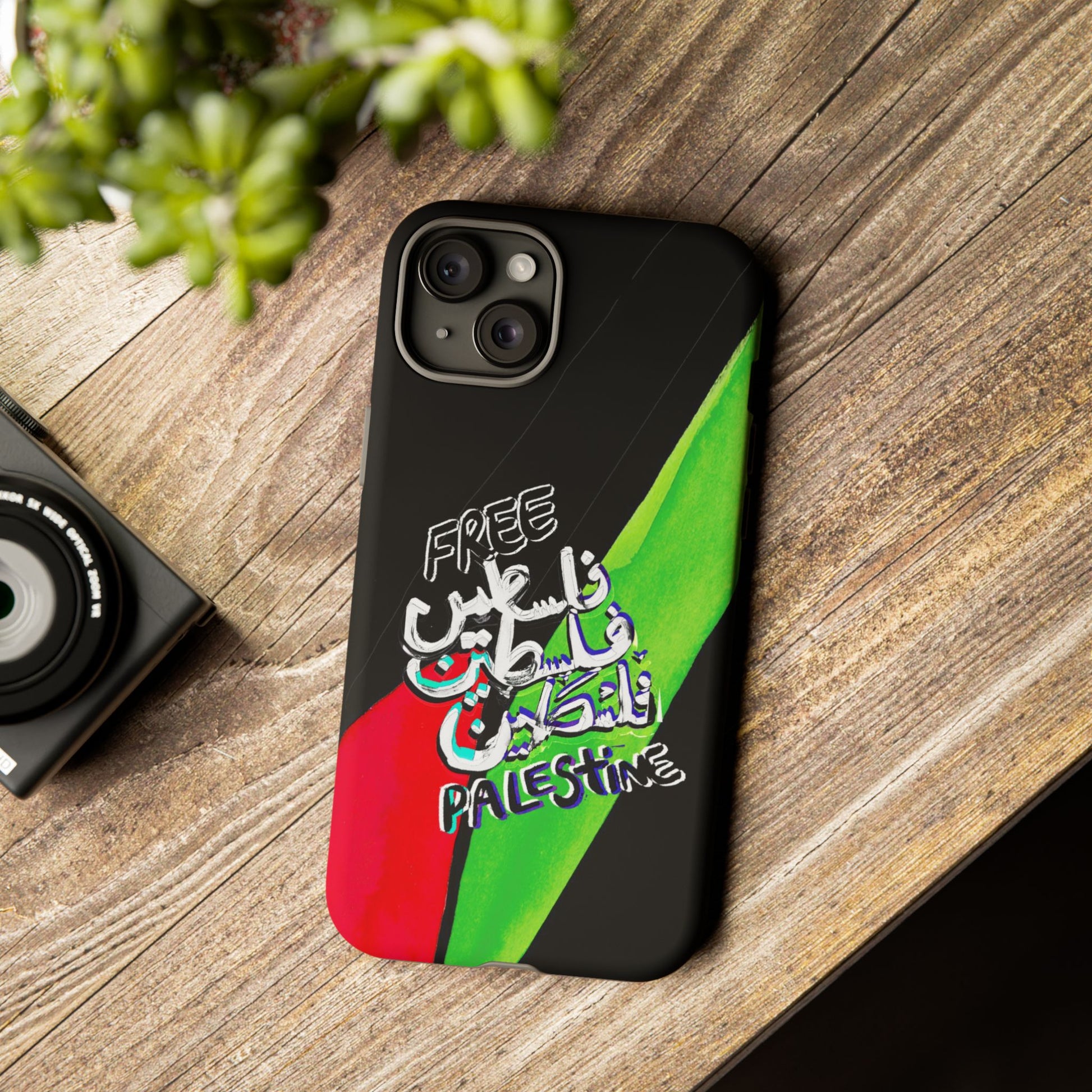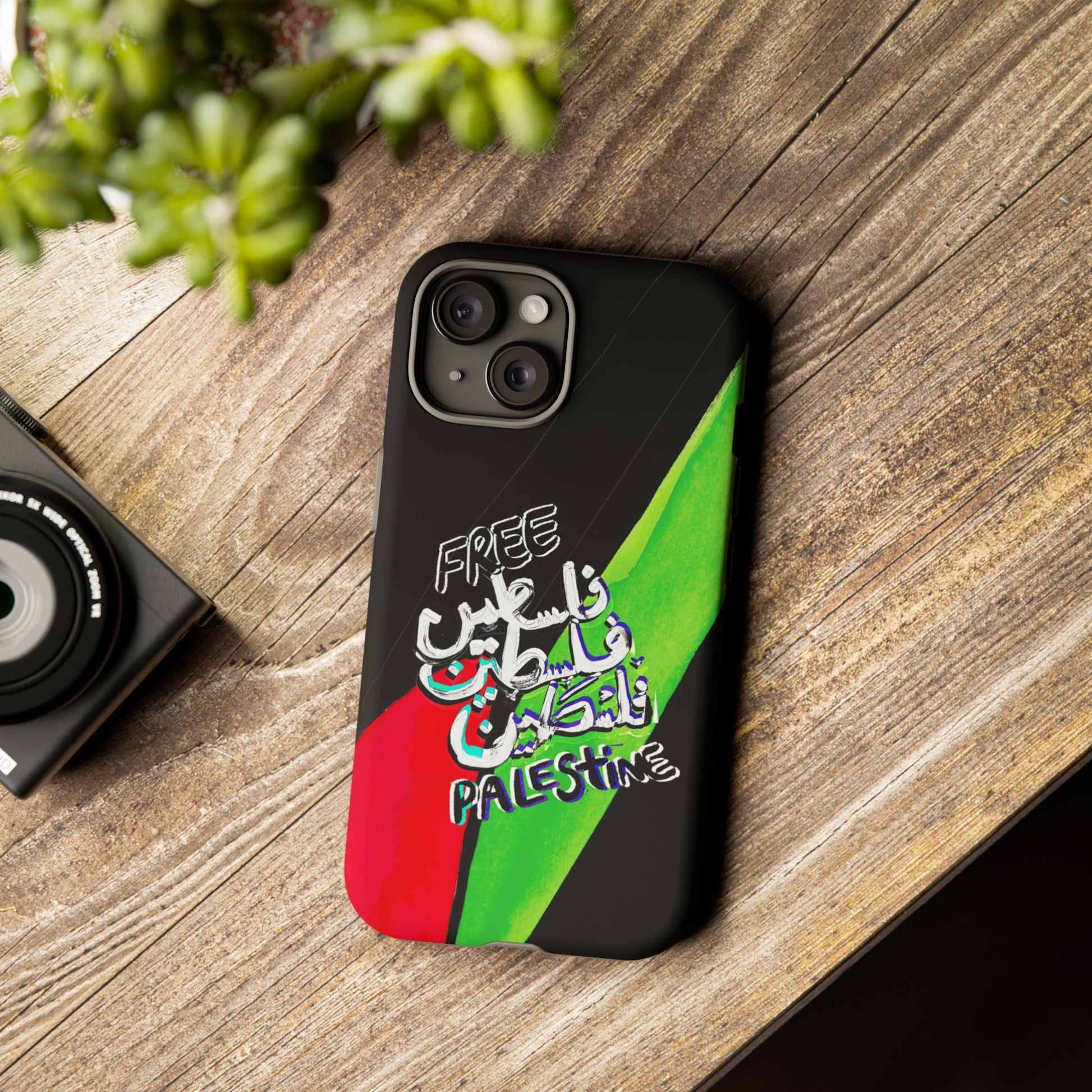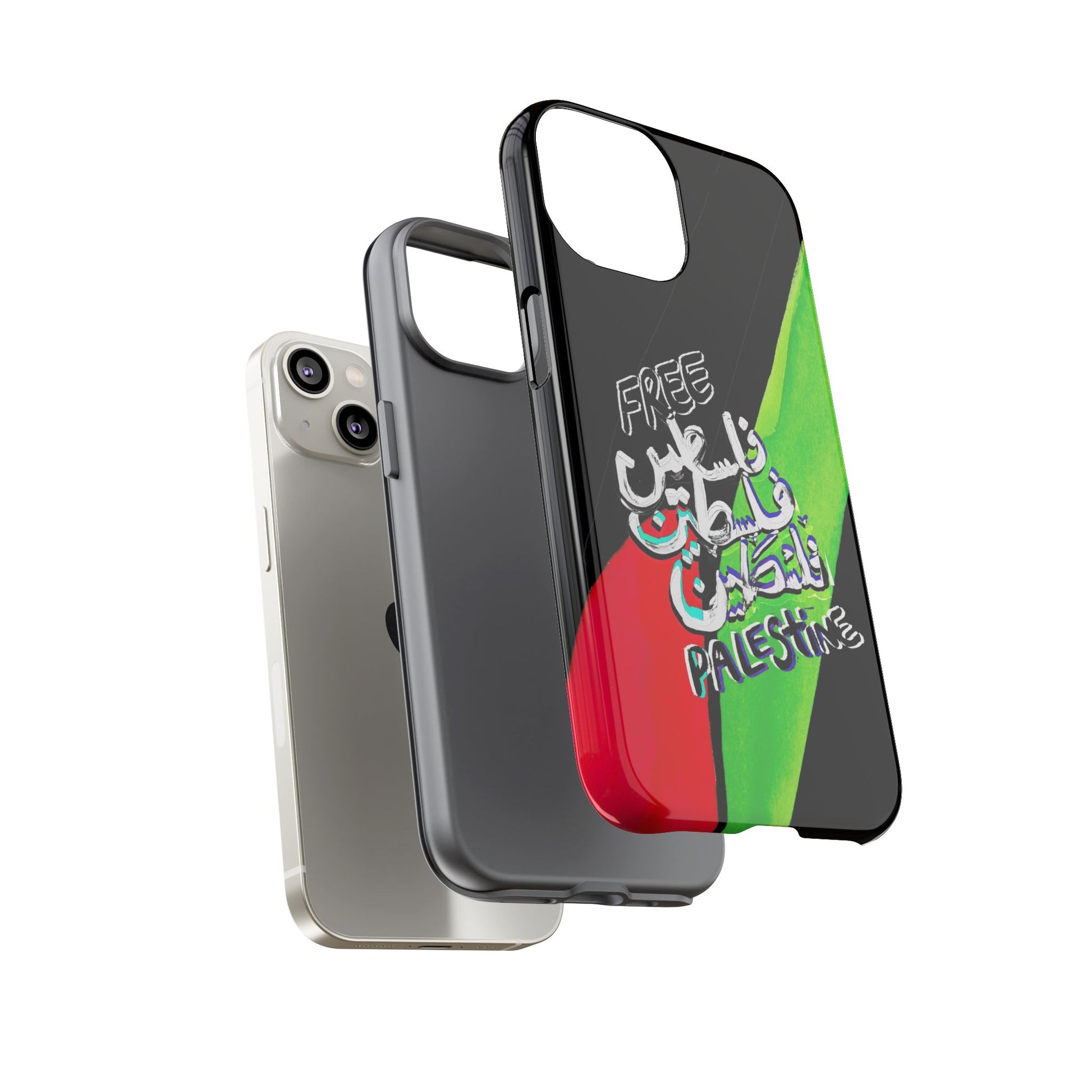 Introducing our exquisite hand-painted Palestine flag and text meticulously crafted onto our stunning tough case, designed to champion aid for Palestine. The text says "Palestine" in Arabic, x3: فلسطين