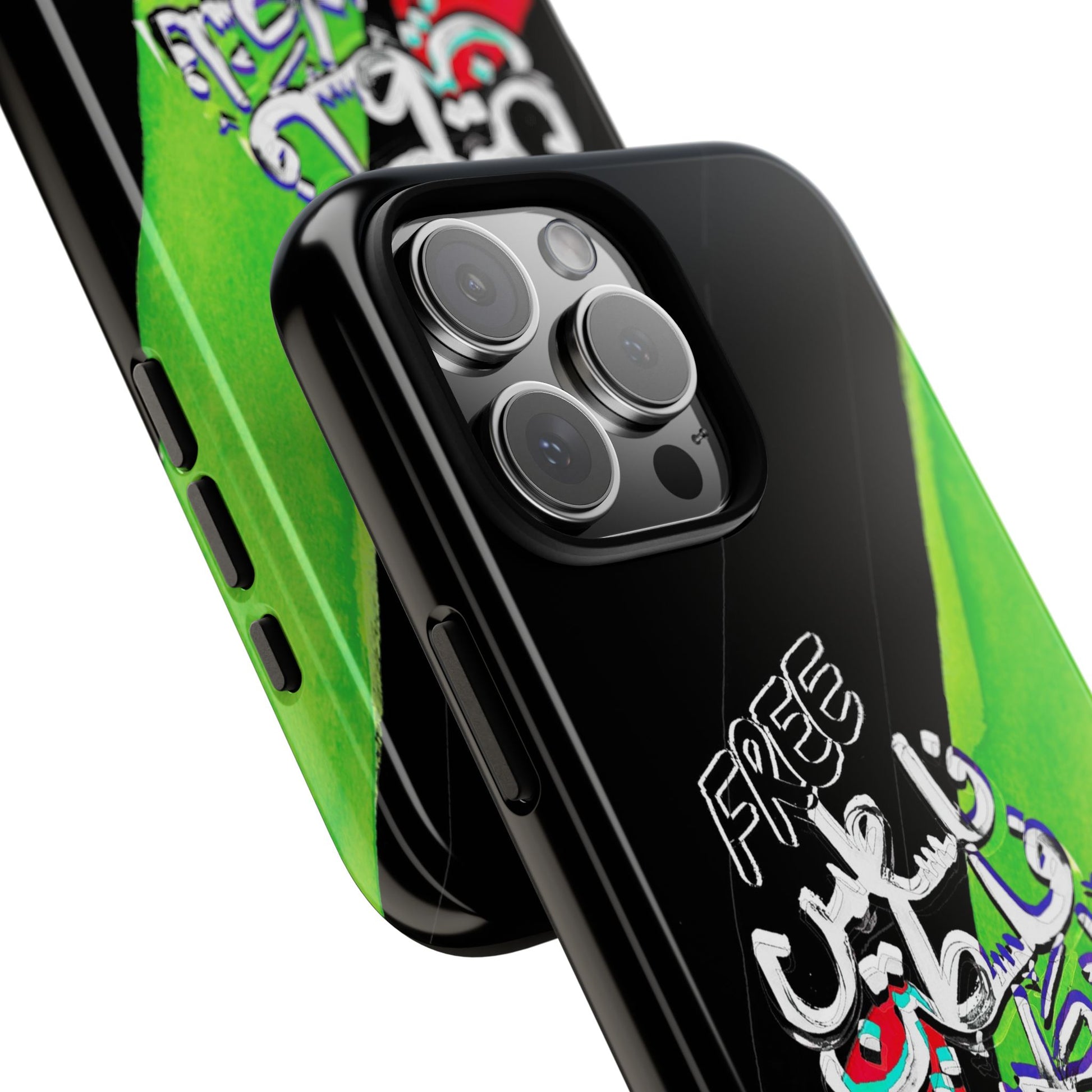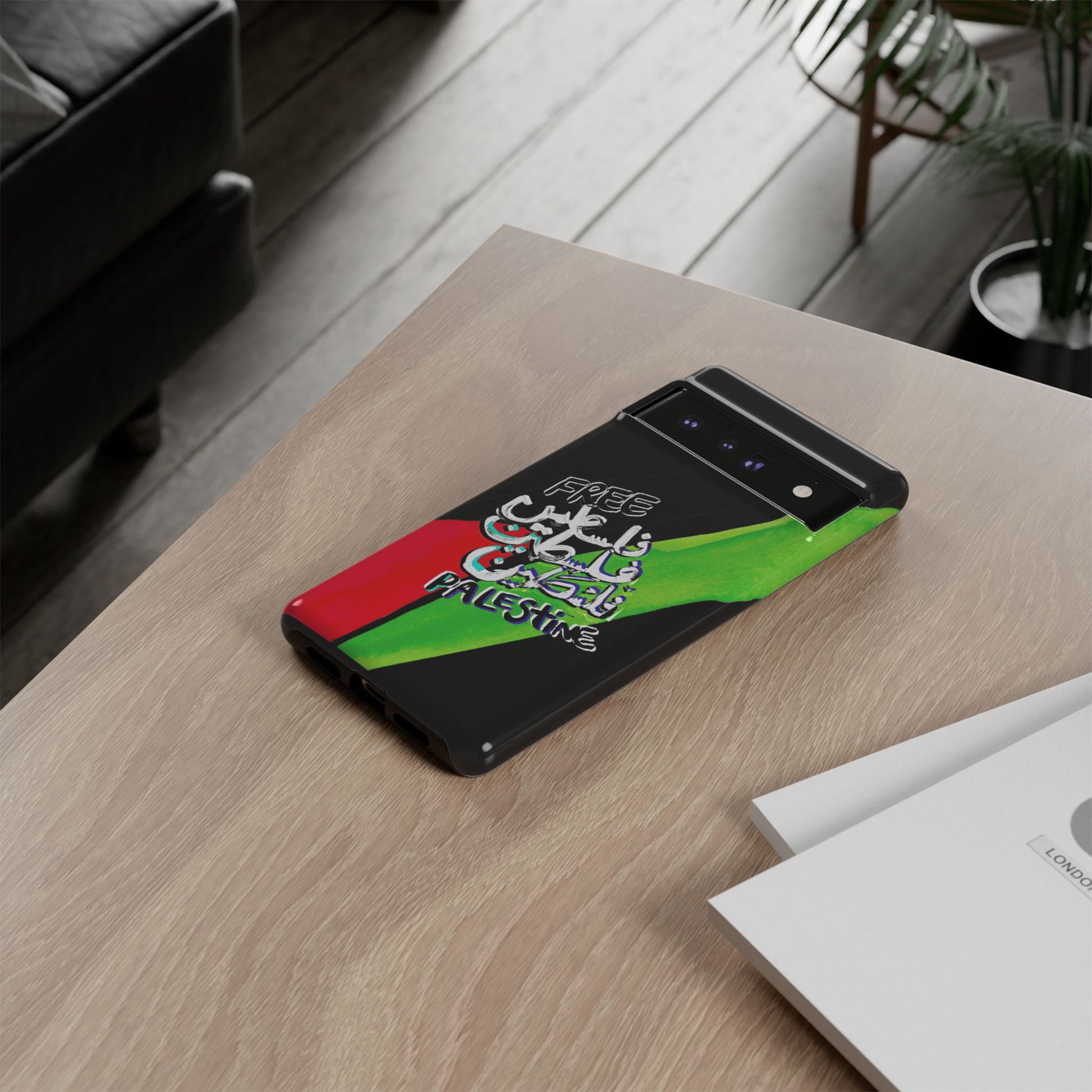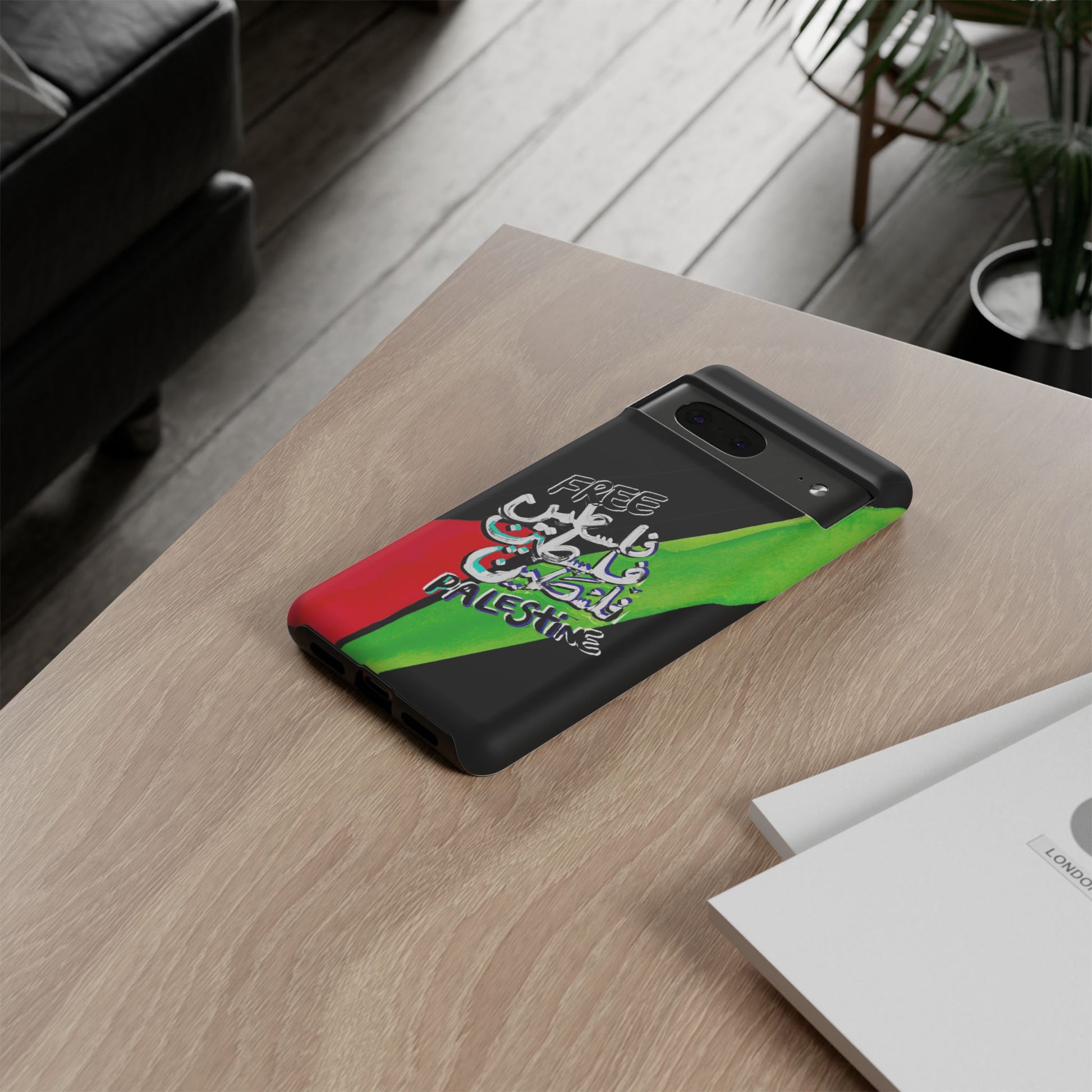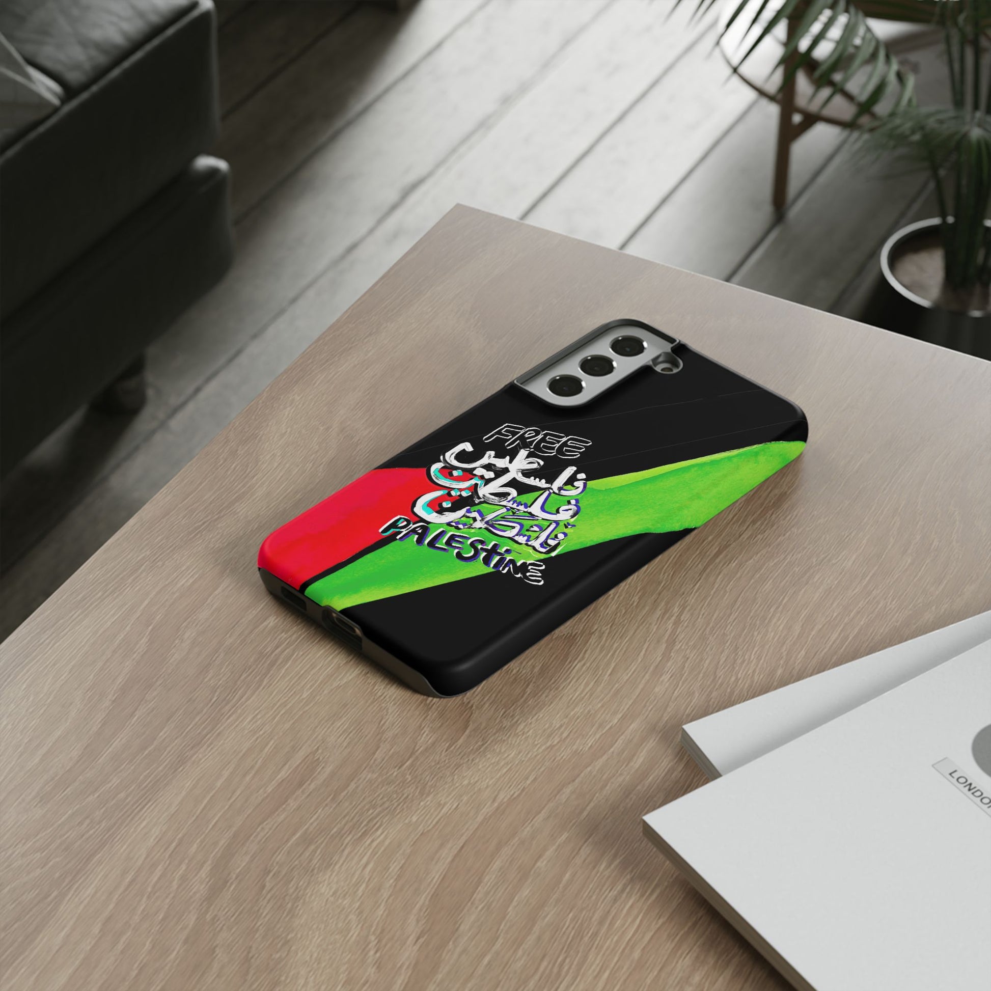 Introducing our exquisite hand-painted Palestine flag and text meticulously crafted onto our stunning tough case, designed to champion aid for Palestine. The text says "Palestine" in Arabic, x3: فلسطين