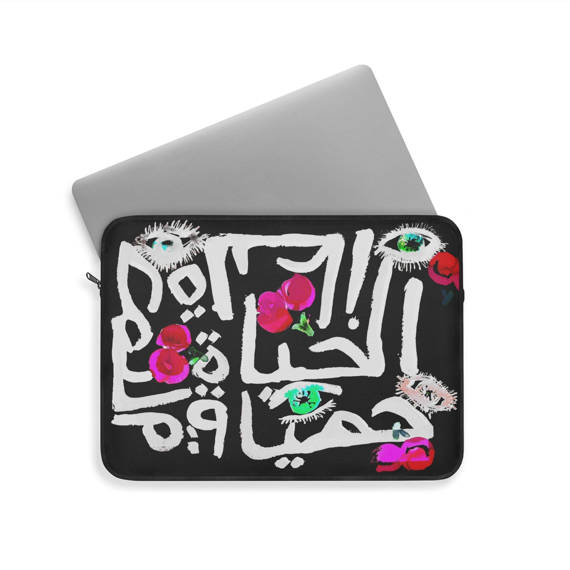 Crafted from premium materials, it ensures optimum protection for your device. The sleeve features a unique, hand-painted graphic illustration by Palestinian artisans, bearing the uplifting message "Life is beautiful" or "Al Hayat Jamila" in Arabic <3
