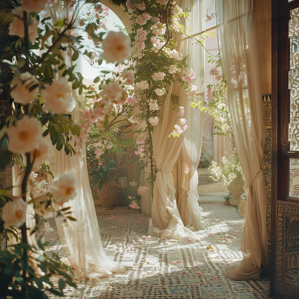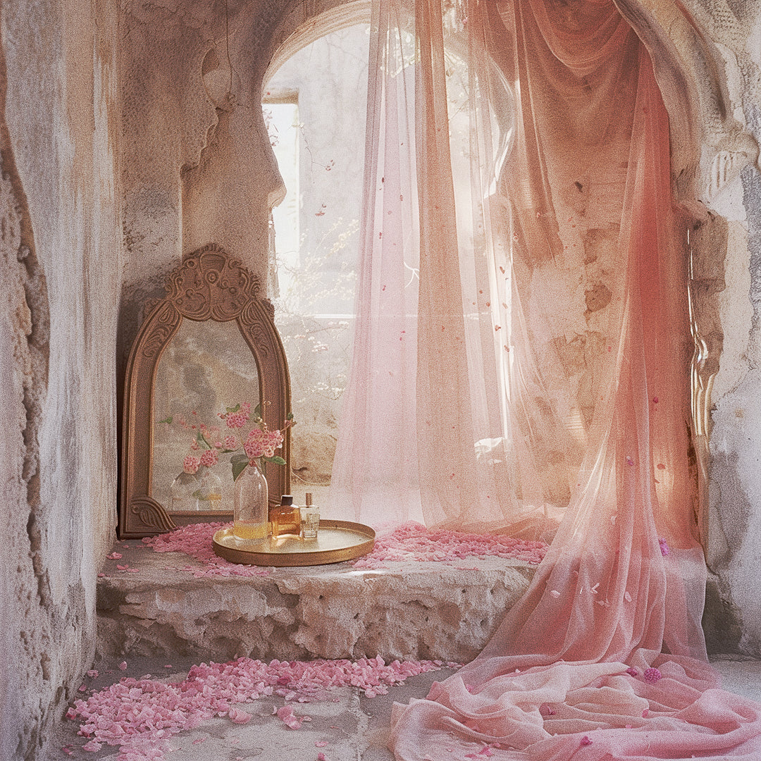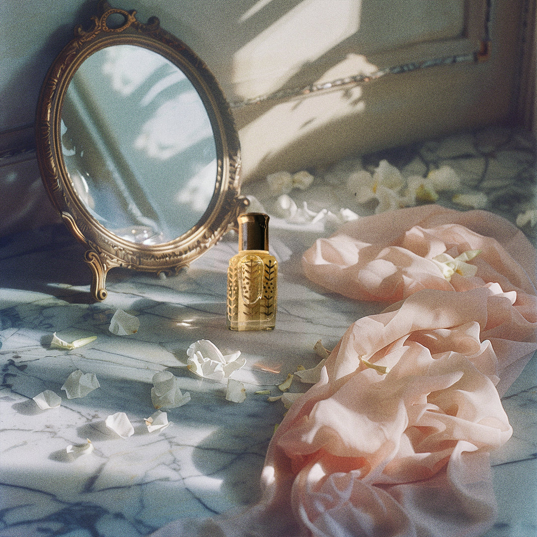 The imagery surrounding this scent is a love letter to quiet mornings in ancient cities — silk curtains swaying in a sun-drenched courtyard, jasmine petals on cool stone, an old mirror catching the light. Shot in a vintage, grainy style, the visuals evoke the softness and stillness this perfume was made to hold.