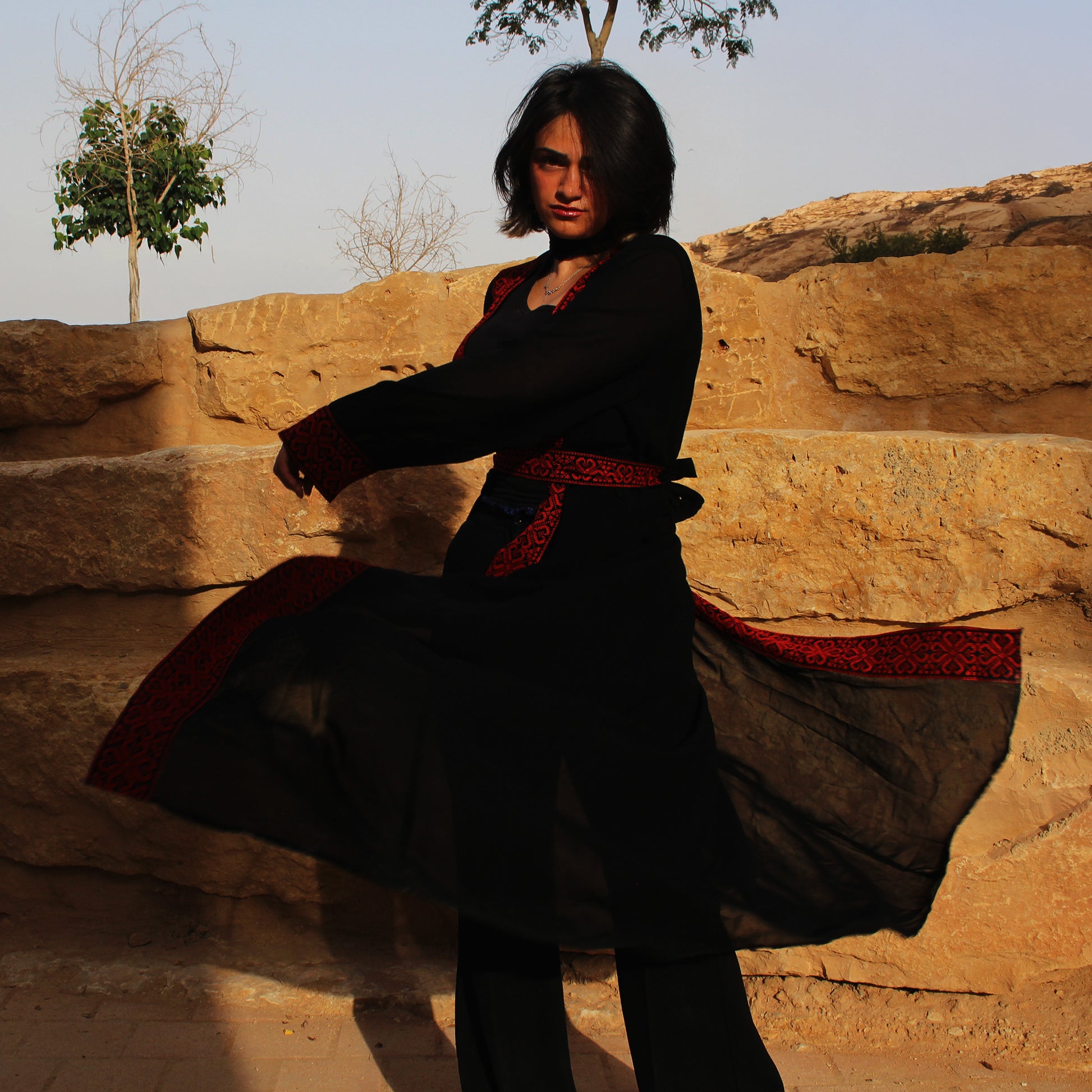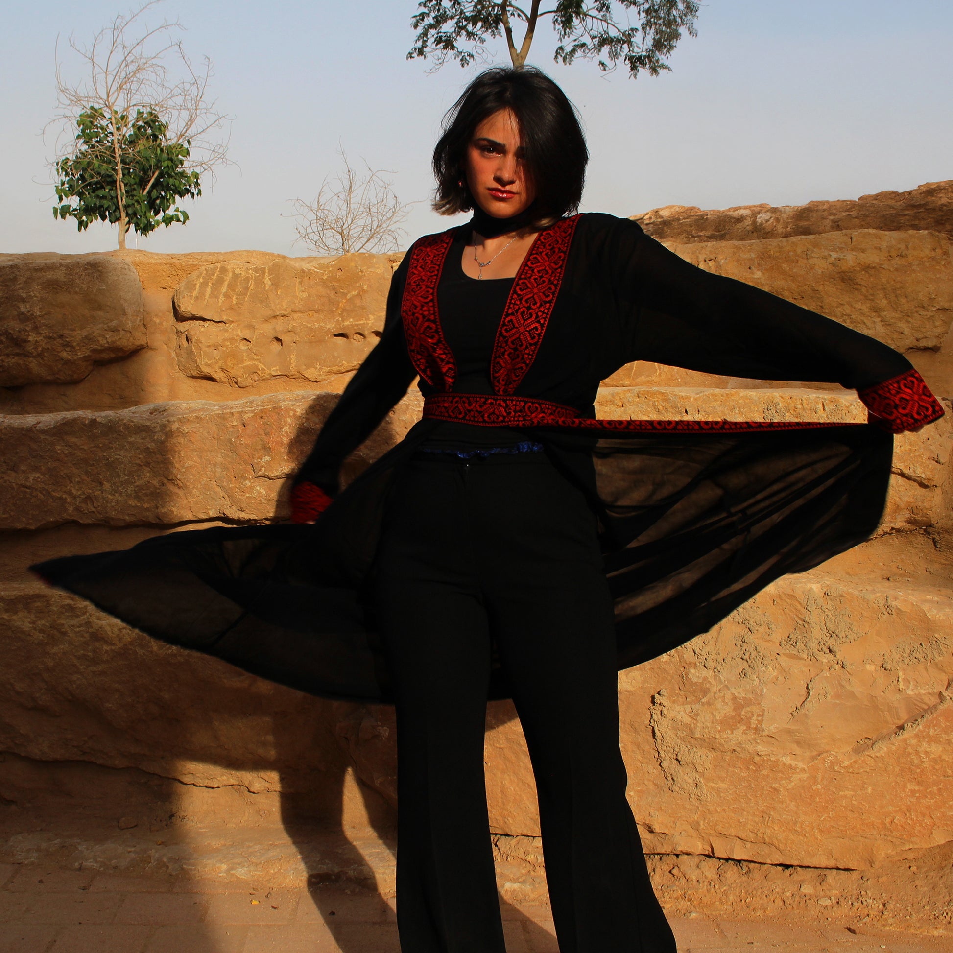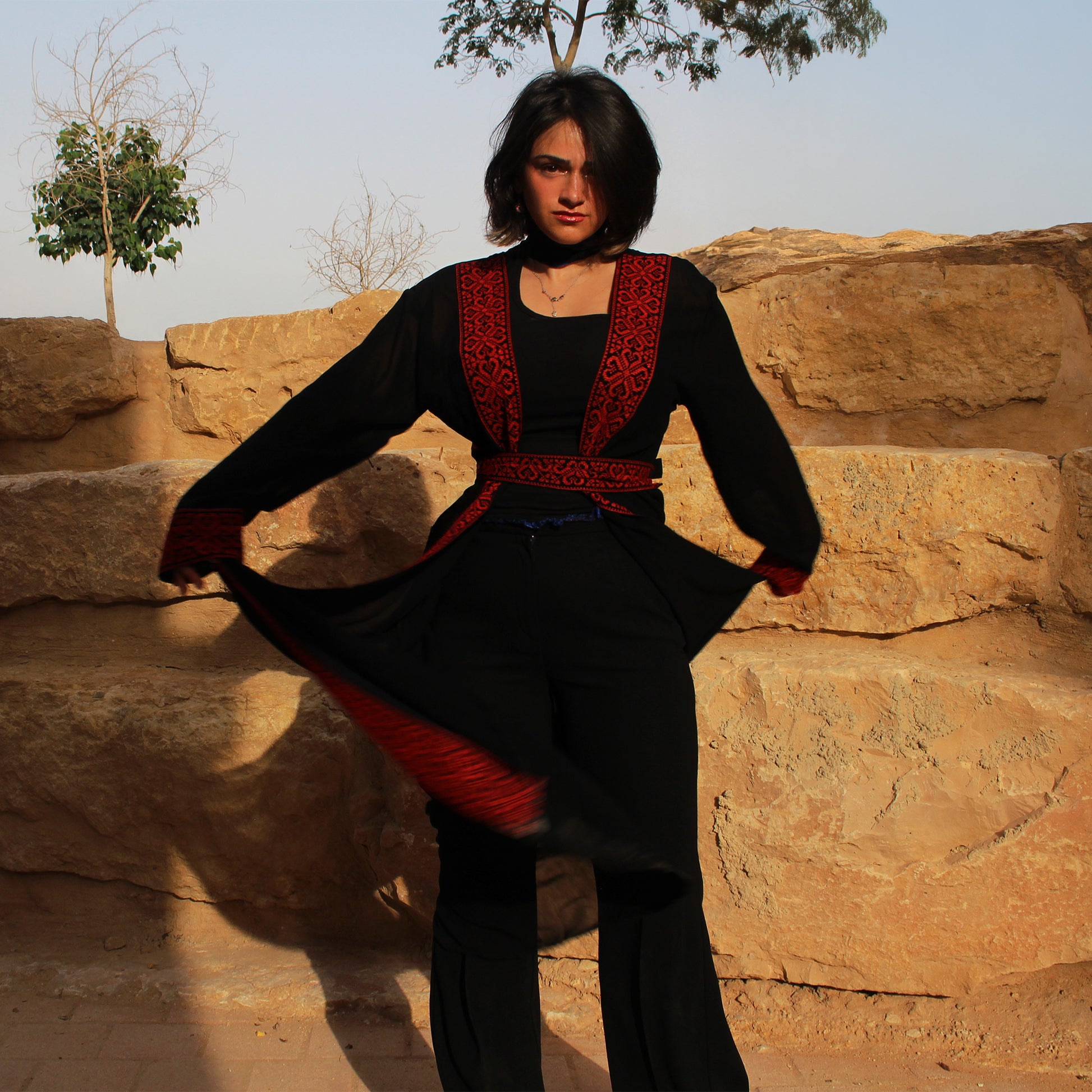 Mysterious, refined, and deeply rooted in tradition — this black bisht is an ode to timeless elegance and Palestinian craftsmanship. Its flowing silhouette is lined with intricate tatreez embroidery, each motif a testament to heritage carried through thread. The richness of the black fabric creates a striking contrast, allowing the embroidery to shine with quiet power.